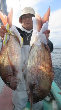 釣果、2名様で、マダイ、キロ以上〜1,8k、4匹、