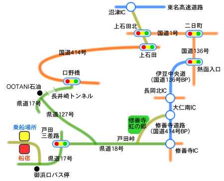 → 進んだ先、左側に船宿、右側が乗船場所となります。(途中の「大仁南IC」を利用する場合はICを降りたら修善寺・虹の郷方面へ