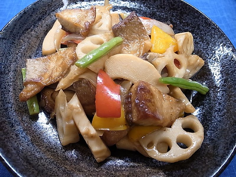 ハス、新たまねぎ、たけのこ、にんじん、ピーマン、パプリカ、等々、一口大に切り揃えます。