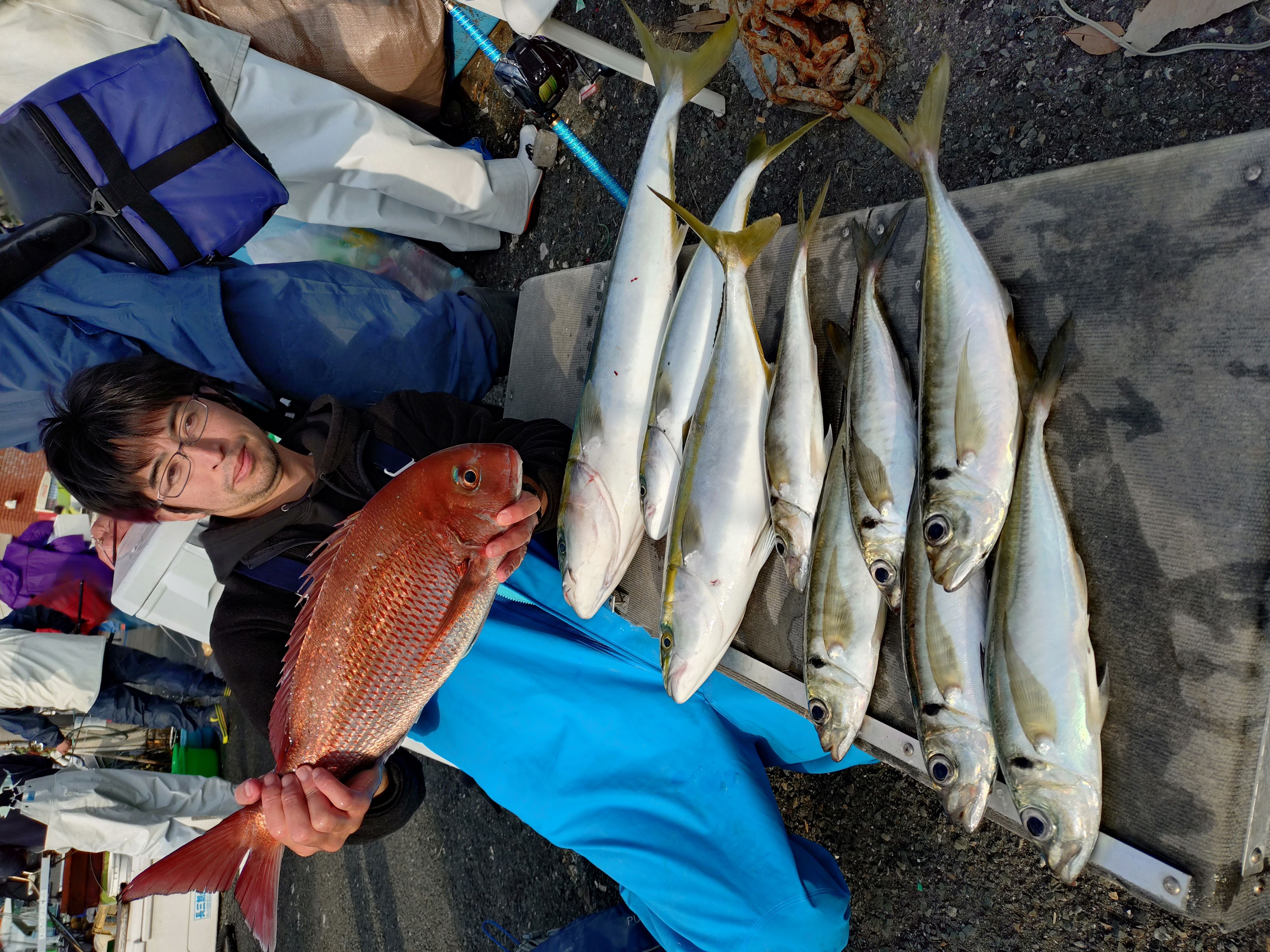 それでもラストは再び浅場へ戻り、良型アジに加えてカイワリ、さらには2.5kgのマダイまで飛び出し、納竿となりました。大釣りこそ無いものの、アジは良型揃いですし、バラエティに富んだ釣果で、皆さんそれなりに満足の一日だったのではないでしょうか。