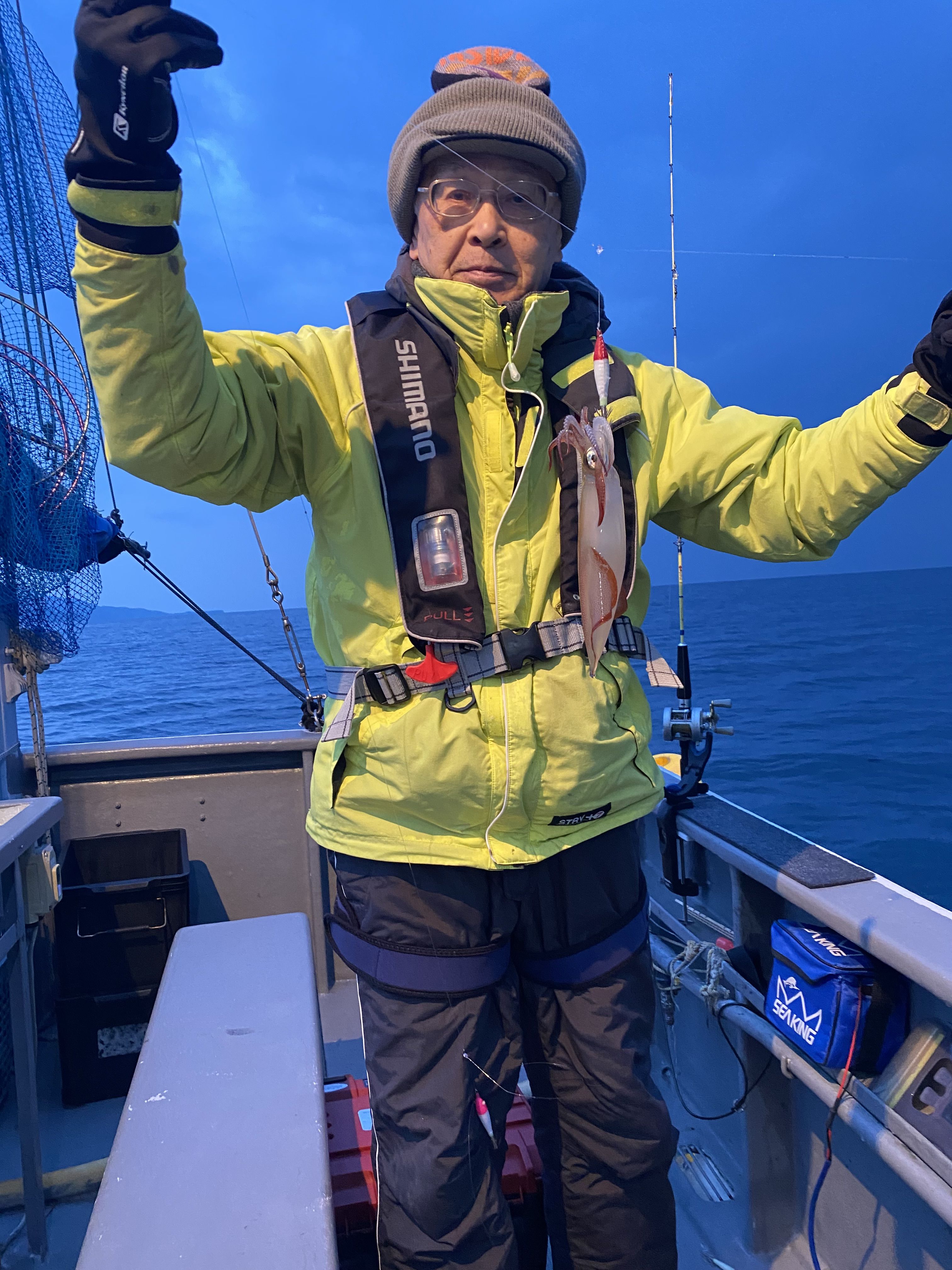 【3日】(火)夜ヤリイカトップ22杯。今日は、オスのでかヤリが多数で10杯有ればクーラー重たくなりました。深夜便です。