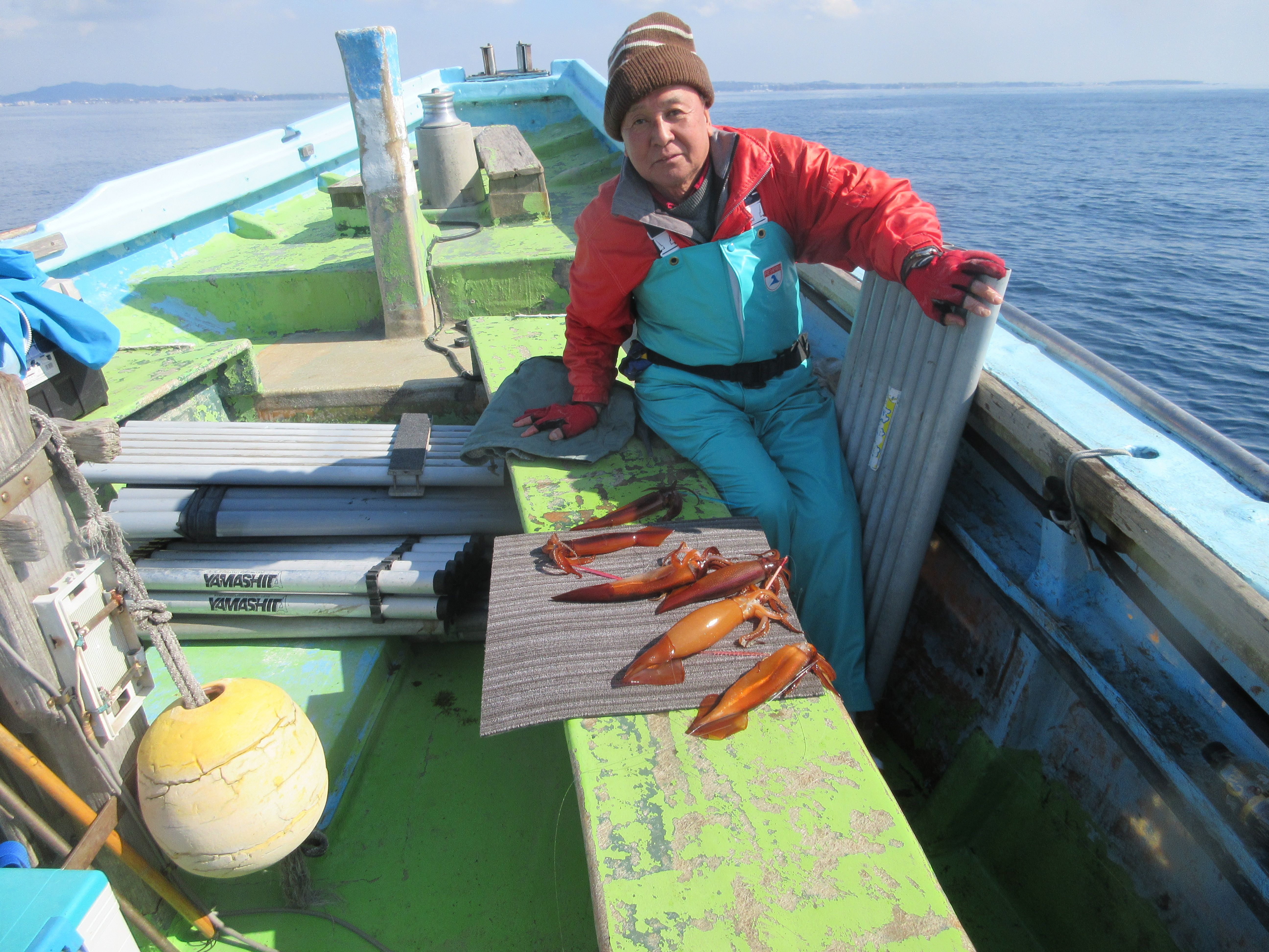 2月21日(土曜日)7時出船 マルイカ狙い 城ヶ島沖に出ました 澄潮です水温15、5℃ 水深60m〜90mマルイカ拾い釣り当り有るねといってます、ヤリイカも混じりました。