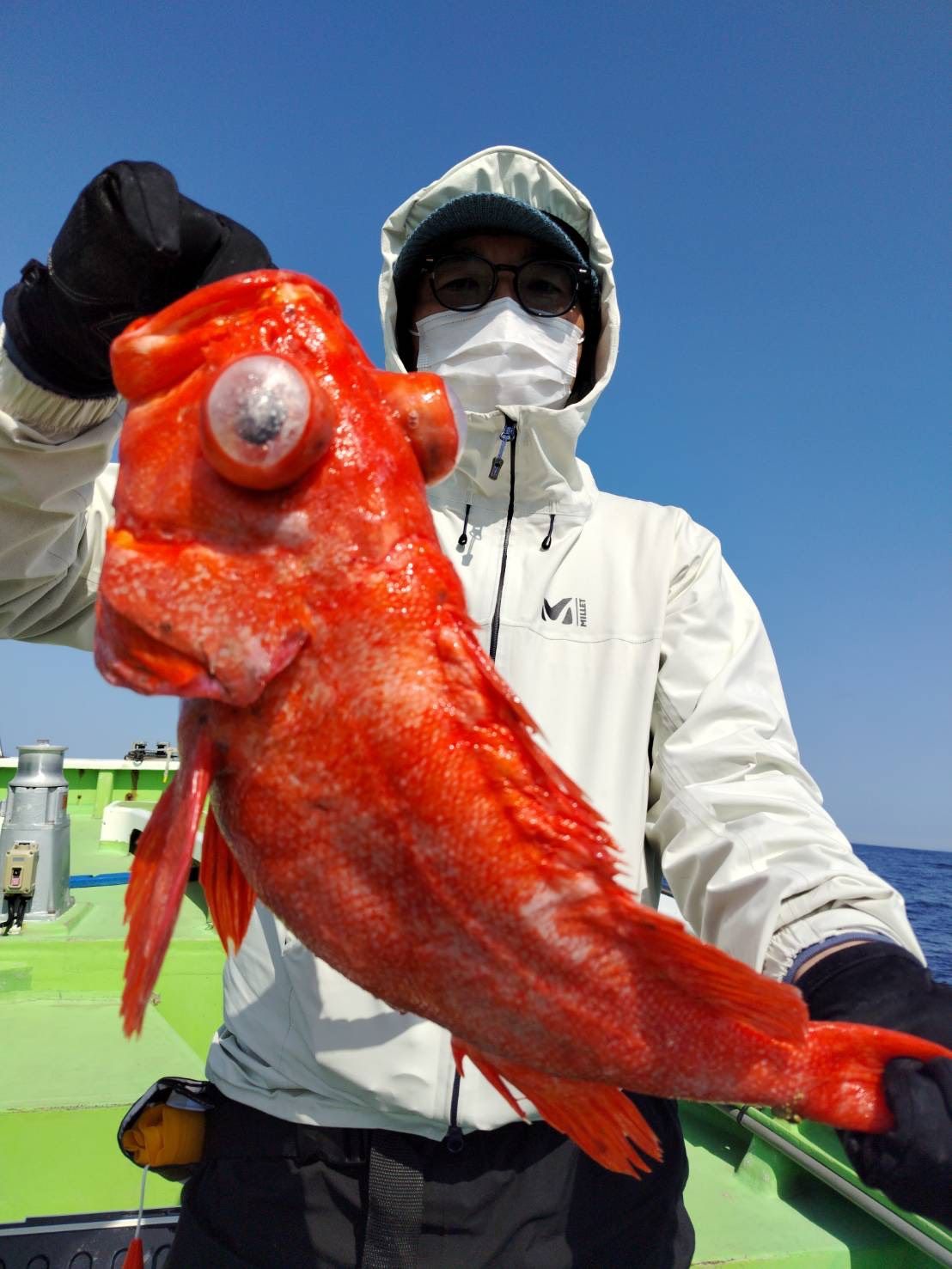 28日、今日も出船出来ました。真鶴沖に行きました。朝のうちは、クロムツ交じりでキンメの顔を見れましたよ!!しかし、直ぐに当たりが止まり、それからは状況厳しかったです。深みでキンメの顔は見れマイsたが、なかなか皆に当たり回らず・・・。クロムツも、イマイチ食わず・・・。それでも何とか皆さん、お土産は出来ました。という事で、今日は、キンメ5〜10枚・25〜30cm、クロムツ2〜7匹・25〜40cm、メダイ・シロムツ、が交じりました。