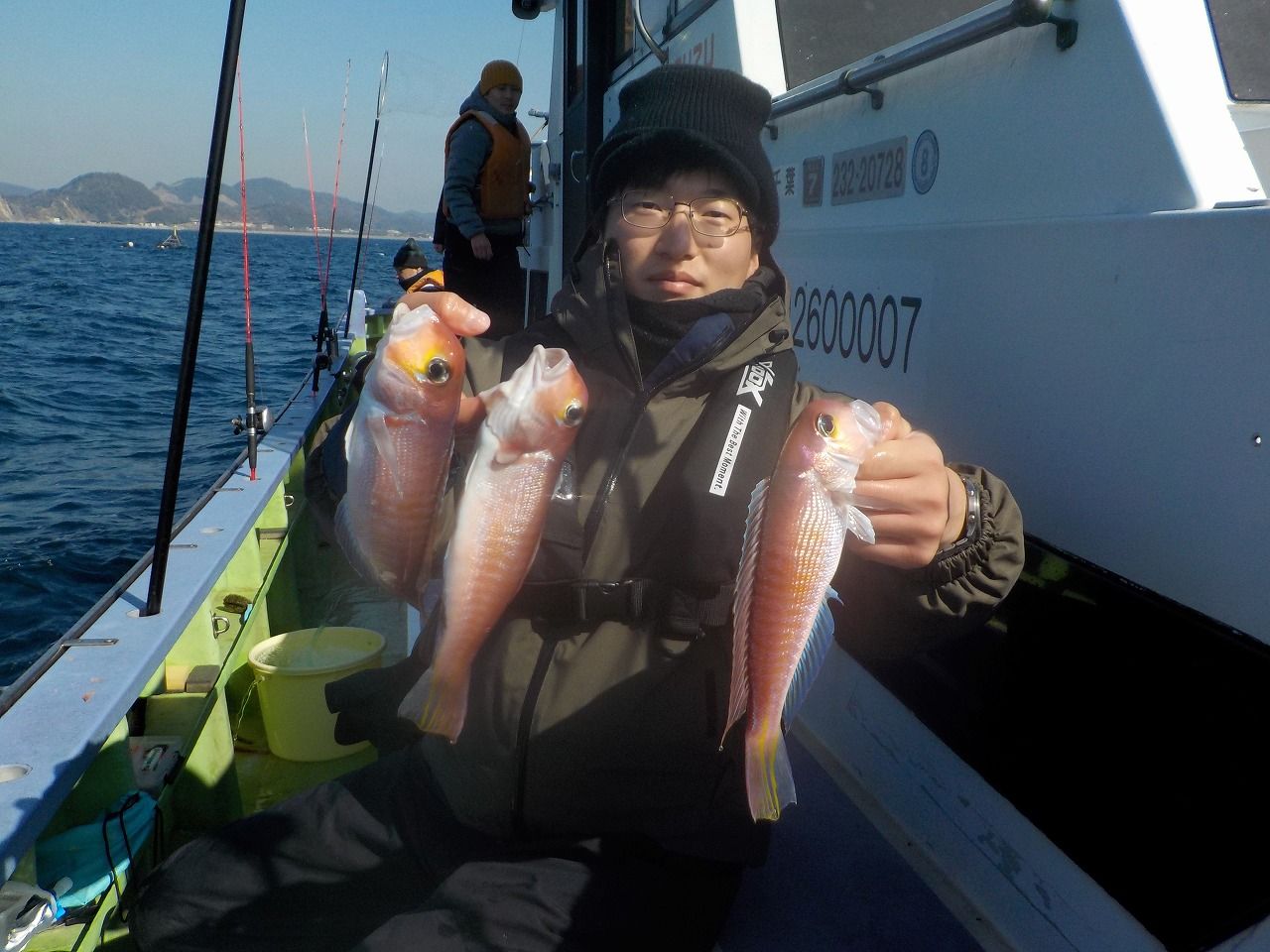 早朝は船の上がガチガチに凍る冷え込みでしたが、日が射すにつれて暖かくなり、海上は良い凪の絶好の釣り日和のなかでのスタートでした。
