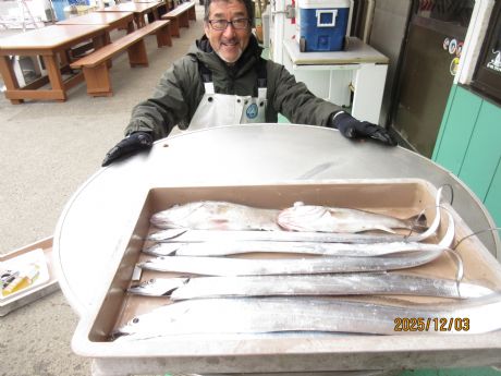 【タチウオ船】6時30分出船・料金11.500円・エサ付き(土・日・祭日はご予約をお願い致します。平日はご予約なしでも乗船出来ます。)・・片テン、オモリ80号.ハリス5−6号2m・1本針・・テンヤ・ルア−・ジギング・・・タナ・60−80m・・・3日の釣果・・・タチウオ、エサ釣り、2−6本、70−108cm、他に、アラ。