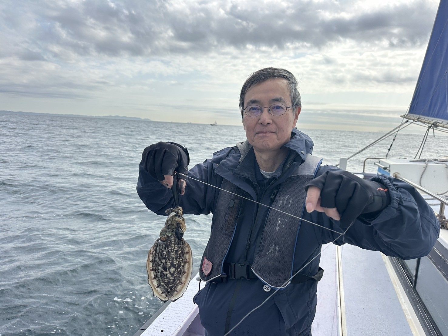 本日は朝から下げ潮で一日中適度に流れましたが、水色も濁り、水温13度と下がった事もあって、活性は低かったです。浅場のポイントから徐々に沖のポイントを点々としました。マルイカは良型中心でしたよ。竿頭はスミイカ2杯マルイカ3杯の計5杯の谷口さんで、特大700gのスミイカが上がりました。