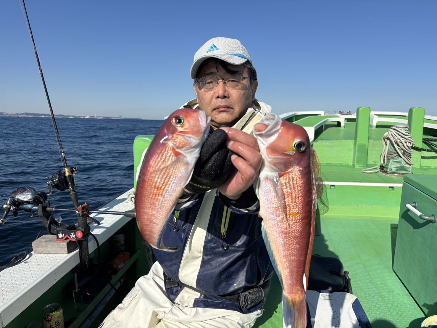 剣崎沖、水深70〜110m、水色は薄濁り。外道は、鬼カサゴ、チカメキントキ、キダイ、アカボラ、トラギスなど。