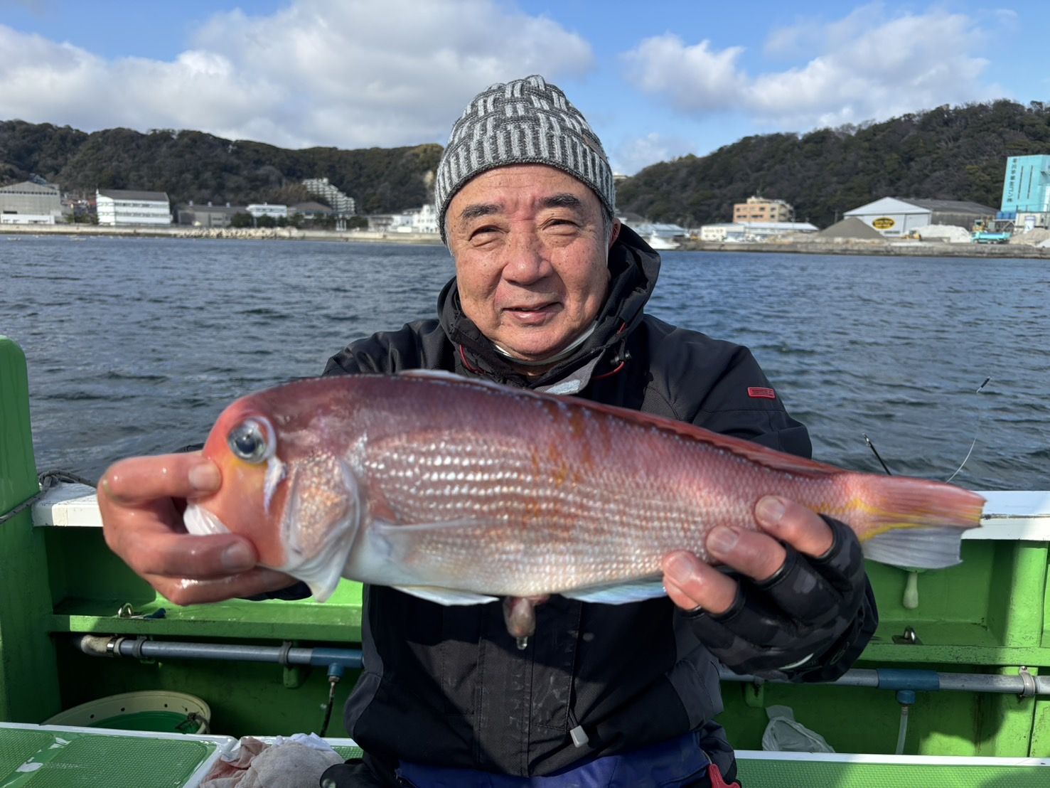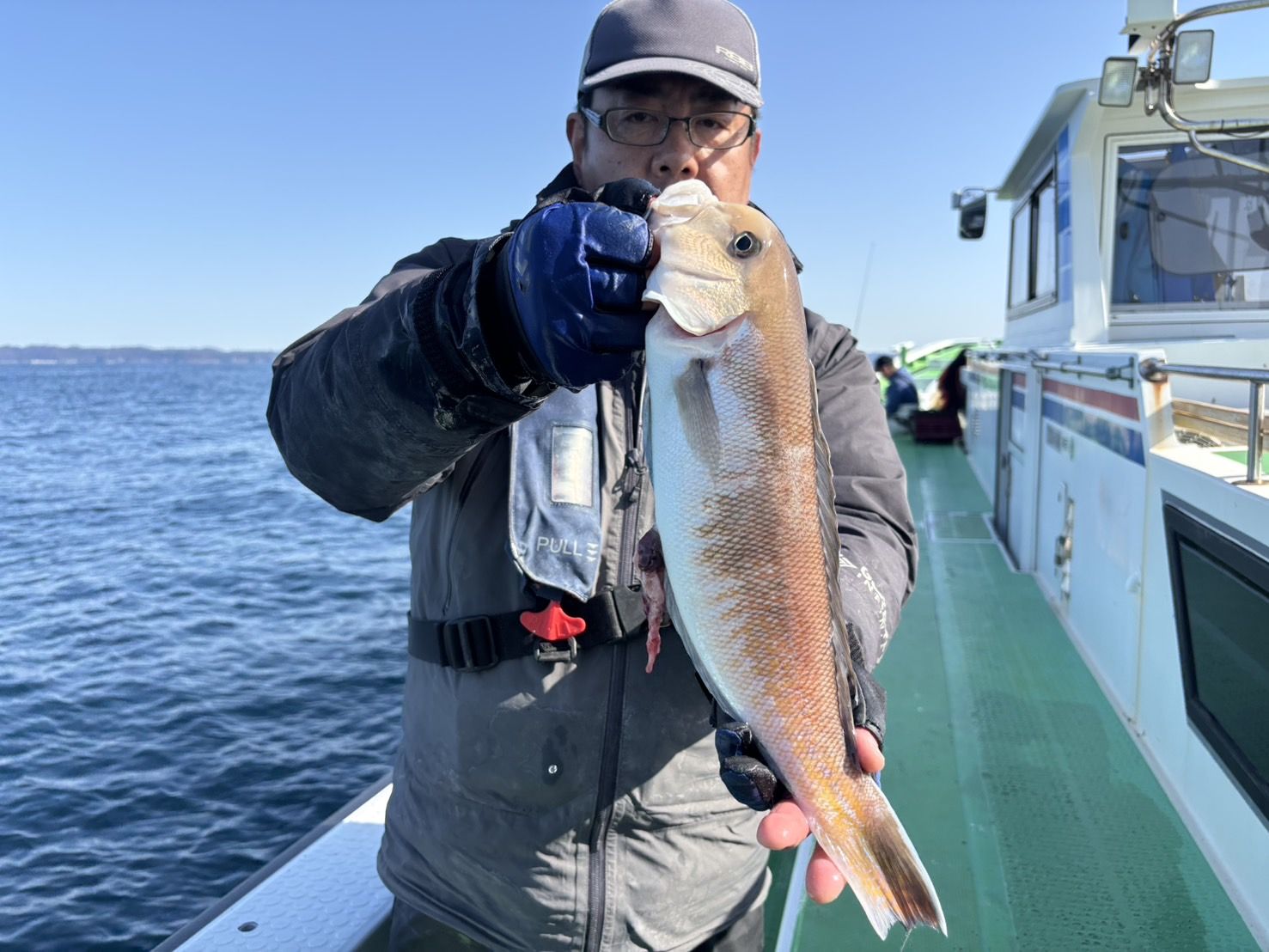 剣崎沖、水深70〜90m、水色は薄濁り。外道は、鬼カサゴ、イトヨリ、キダイ、アカボラ、トラギスなど。